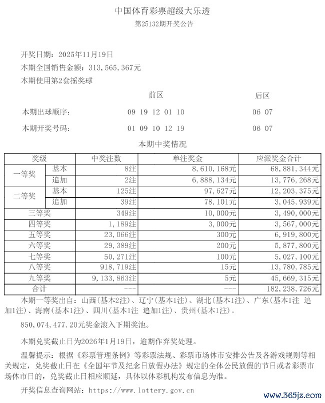 北京技术11月19日晚,体彩大乐透第25132期开奖,当期开奖号码为前区01 09 10 12 19,后区06 07。